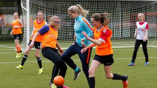 Kelly Zeeman duelleert met enkele deelneemsters aan de ING Ballenmeid-selectiedag. - Foto: KNVB Media