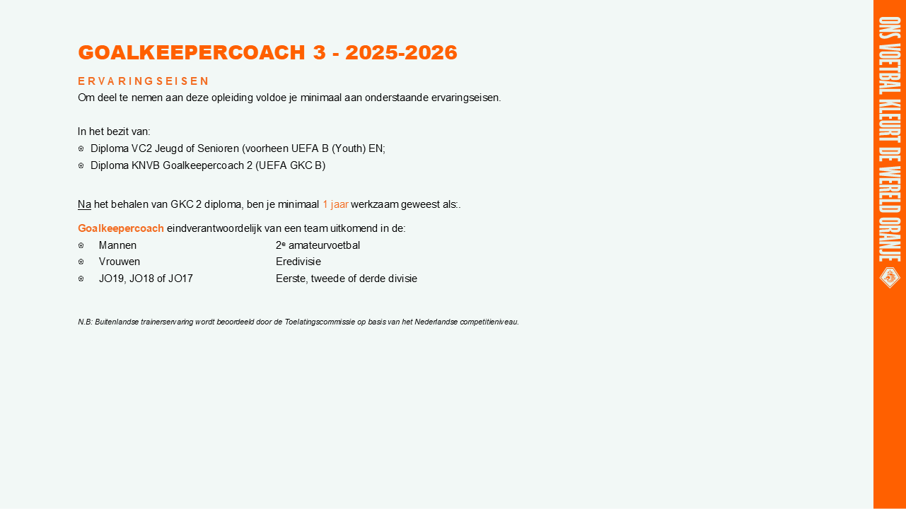 De inschrijving voor de opleiding Goalkeepercoach 3 seizoen 2025/’26 opent op maandag 26 mei 2025.