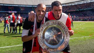 Karim El Ahmadi en Steven Berghuis tonen vol trots de kampioensschaal van Feyenoord. - Foto: KNVB Media