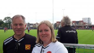 "Ja, dan moet je er even staan als organisatie", zegt Marjard Krijger, penningmeester van Sporting'70 en nu vooral vrijwilligerscoördinator. "Vandaag gaat alles prima, maar afgelopen woensdag werden we door de media platgebeld over die kwestie. Dan moet je als kleine amateurvereniging opeens je verhaal klaar hebben. Dat valt niet mee, en eerlijk gezegd hadden we op dat moment wel iets meer steun van de EK-organisatie verwacht. Zo moesten we de extra beveiliging die hier nu rondloopt, samen met de Engelse bond zelf regelen. Dat is iets waar we normaal nooit mee te maken krijgen natuurlijk."