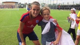 De Engelse middenvelder Jill Scott met een jeugdlid van Sporting'70. - Foto: KNVB Media
