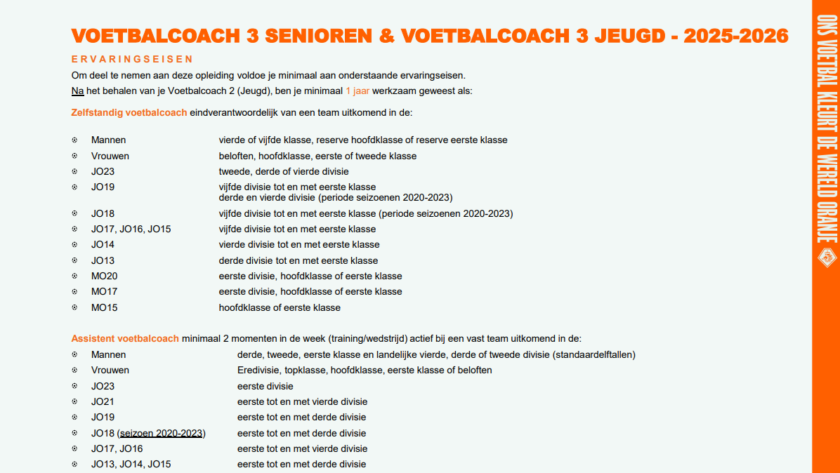 Let op: De ervaringseisen voor de Voetbalcoach 3 Senioren & Voetbalcoach 3 Jeugd-opleidingen zijn hetzelfde, de inhoud van de opleidingen verschilt wel. Zorg dat je inschrijft voor de juiste opleiding zodat je je kunt ontwikkelen in de betreffende doelgroep.