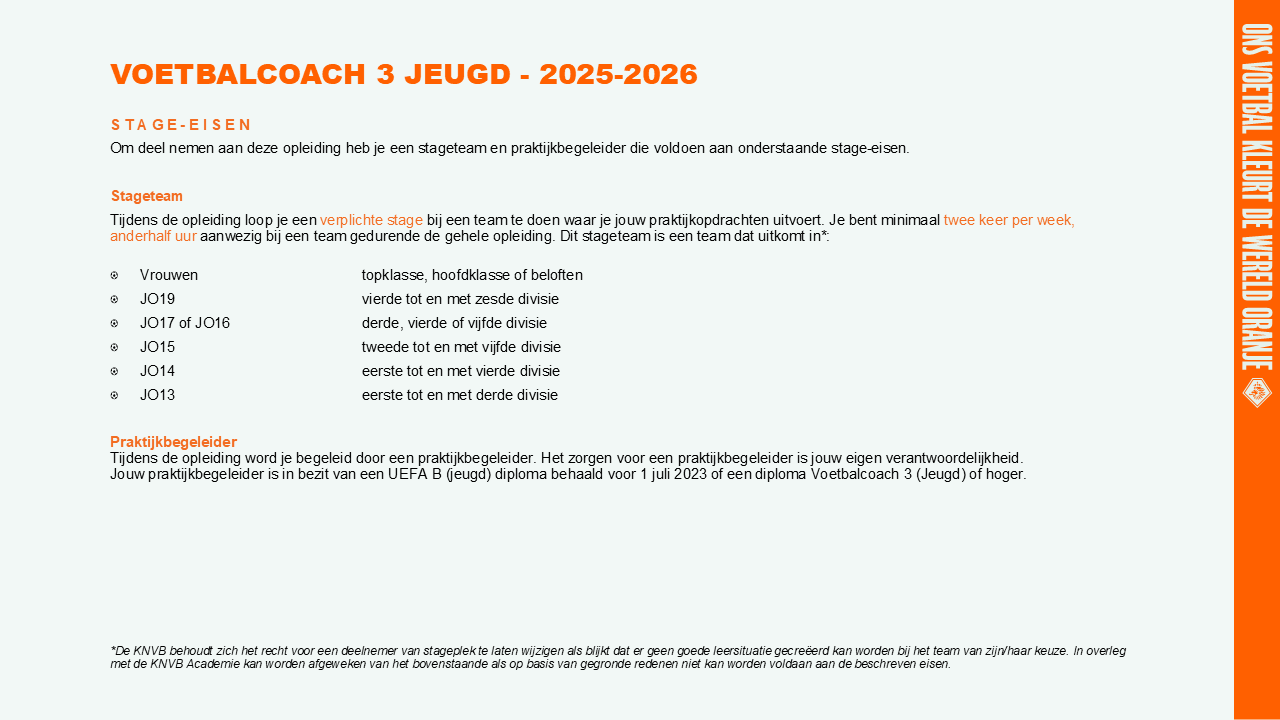 Jouw stage elftal dient uit te komen op een van onderstaande niveaus*. Je bent minimaal twee keer per week anderhalf uur aanwezig bij dit team gedurende de gehele opleiding.