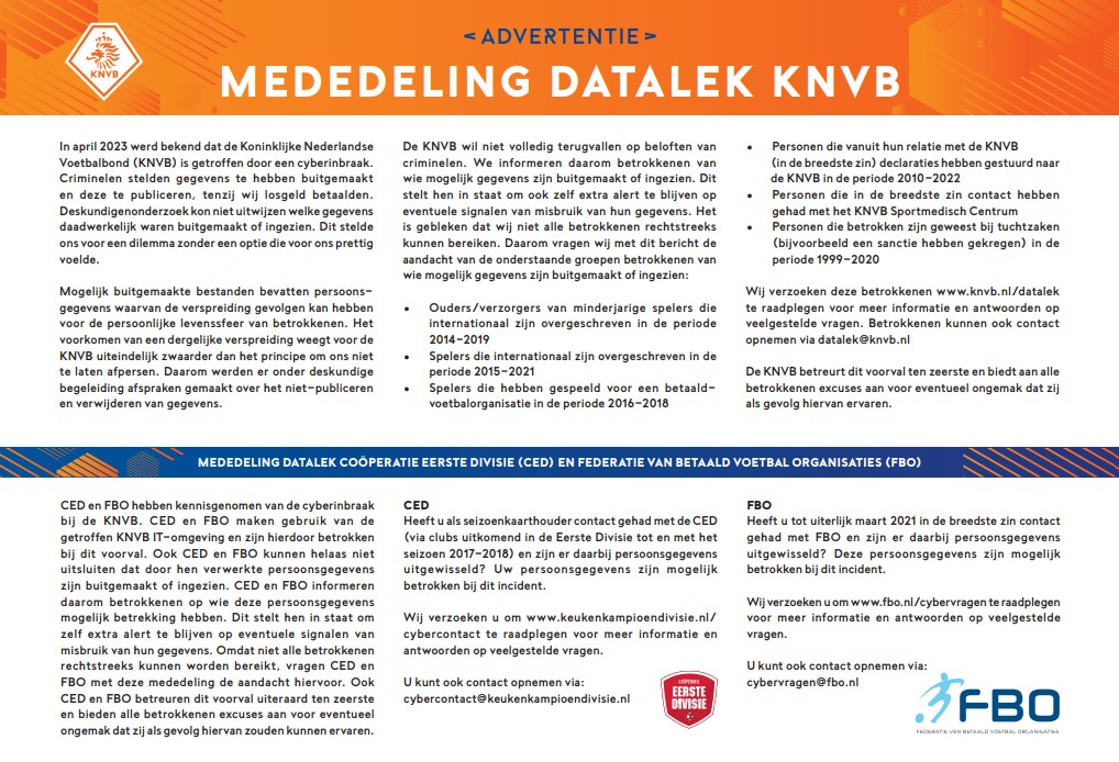 Let op: De Coöperatie Eerste Divisie (CED) en de Federatie van betaald voetbal organisaties (FBO) hebben eveneens een mededeling gedaan over de KNVB-cyberinbraak. Controleer op hun webpagina of jouw gegevens mogelijk via hen alsnog bij dit datalek betrokken zijn.