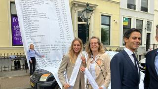 Marit Bouwmeester (links) en Natascha van Grinsven- Admiraal voor de metershoge kassabon. Ook D66-fractievoorzitter Rob Jetten was aanwezig bij de actie op Prinsjesdag. - Foto: KNVB Media